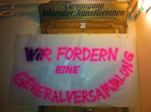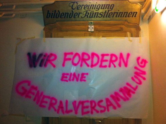 Rudolfine Lackner began her presidency without being elected and has continued to occupy this position since 1998 – without once organizing formal elections as stated in the regulations (at most issuing statements to the members that she would simply remain in her position.) Due to a lack of transparency, contesting this decision on a legal level was hard to undertake. It was never clear if Lackner’s statements should be taken as a de facto election, or which public space could be otherwise used to bring these problems to the fore. Constant personal conflicts between the president and the members only aggravated this situation. These are just some of the reasons why the VBKÖ did not have an inclusive organizational structure for years. We believe a more engaged group of members would counterbalance the president’s position of absolute authority. Further, a members’ forum would openly expose the exclusions taking place and eventually elect another president – if these shortcomings would be openly discussed amongst a greater plurality.