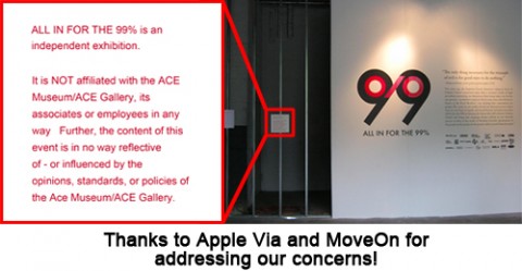 Sign Posted by Apple Via and MoveOn at “All in for the 99%” at Ace Museum