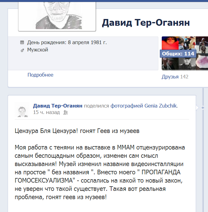 The opening of the exhibition was attended by six LGBT activists from among those who participated in Ter-Oganyan’ video-project, and who noticed the change in the title and explanation of the work. The artist did not realize that before the opening he should have checked if the curator (Ekaterina Inozemtseva) was begin honest with him. When he turned to the organizers for explanations, they assured him that on Friday (the third day of the exhibition) they would correct the title and explanation of his work. But on Saturday night he learned that he had been deceived. It was then that it was finally revealed to him that the museum had no intention of correcting anything.