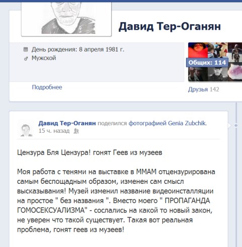 My work involving shadows on display at the MMAM was censored in the most merciless way, by changing the very meaning of my statement! The museum changed the name of my video-work to simply “Untitled.” – instead of my original title “Propaganda of Homosexuality,” referring to the new law – which I am not sure exists yet. This is the real problem: they are driving gays out of museums!
