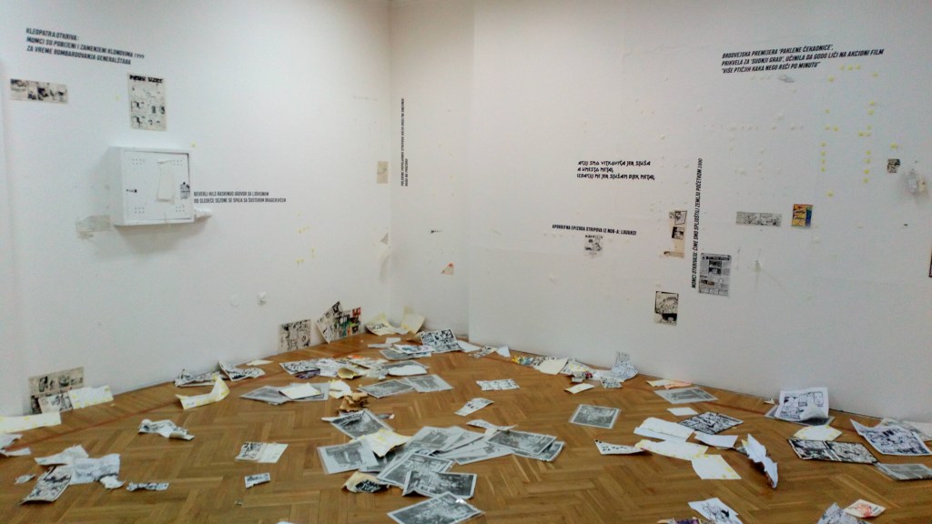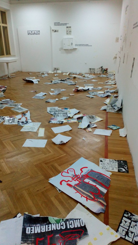 The occasion for the solidarity gathering was the recent attack on the exhibition of comic drawings created by the group “Momci” during the Yugoslav wars in the 1990’s. Five days ago, a group of young people dressed in black and equipped with tear gas had entered the Stara Kapetanija Gallery and devastated the entire exhibition ( https://www.telegraf.rs/english/3249565-threats-over-drawing-of-a-bloodied-baby-carried-out-hooligans-break-into-exhibition-throw-tear-gas ).